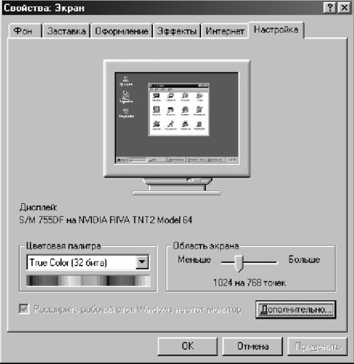 Посмотреть названные характеристики вашего монитора вы можете в окне Свойства: Экран, которое вызывается выполнением команды Мой компьютер | Панель управления | Экран | Настройка – рис. 2.16.