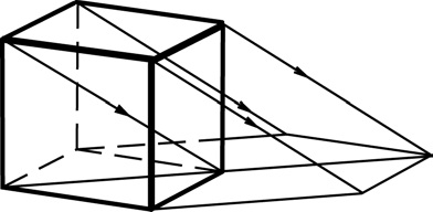 Прежде чем начинать изображать тени на поверхностях, необходимо определить положение источника света. Обычно принято считать, что световой поток идет сверху слева. При таком размещении источника излучения освещены верхняя и левая часть объекта. Если объект изображен в ортогональных проекциях, направление лучей совпадает с направлением диагонали куба, построенного в этих осях. На рис. 1.20 показано построение падающей тени для куба.