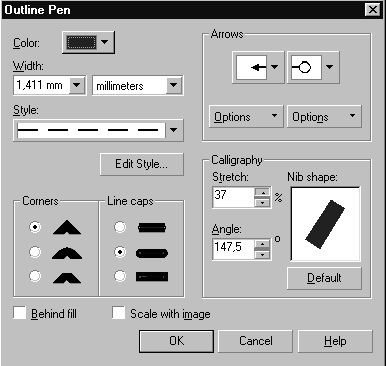 Важное свойство линий векторной графики – возможность сохранять или изменять их толщину при масштабировании всего изображения. В CorelDraw для этого нужно снять или установить параметр Scale with image (Масштабировать вместе с объектом) в диалоговом окне Outline Pen (Параметры обводки).