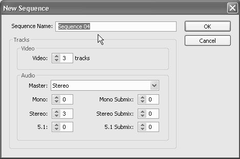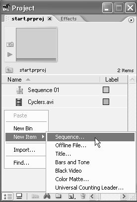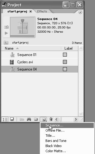3. Для создания еще одного фильма нажмите кнопку New Item (Создать) на панели инструментов окна Project (Проект). В появившемся всплывающем подменю выберите пункт Sequence (Фильм) (см. рис. 2.22). Затем нажатием кнопки ОК закройте появившийся диалог New Sequence (Создание фильма).