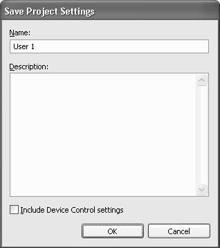 3. В открывшемся диалоговом окне Save Project Settings (Сохранить установки проекта) (рис. 4.13) введите имя новой установки в поле Name (Название) и, по желанию, ее краткое описание в поле Description (Описание).