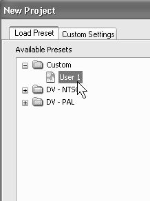 После сохранения предустановки при создании нового проекта она станет доступной в диалоговом окне New Project (Создание проекта). Всякий раз при попытке загрузить установки проекта в списке предустановок в группе Custom (Установки пользователя) будет присутствовать и предустановка пользователя (рис. 4.14).