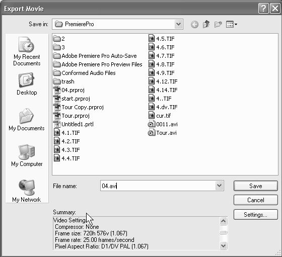 3. В открывшемся диалоговом окне Export Movie (Экспорт фильма) нажмите кнопку Settings (Установки). Перед этим обратите внимание на то, что текущие установки экспорта перечислены в списке Summary (Описание) в нижней части окна (рис. 4.15).