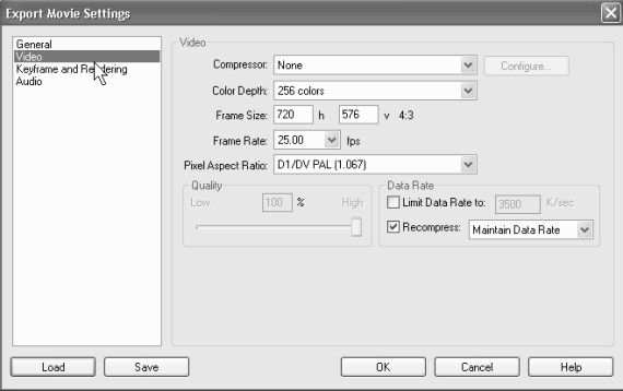 1. Вызовите диалоговое окно Export Movie Settings (Установки экспорта фильма) и нажмите в нем кнопку Load (Загрузить).
