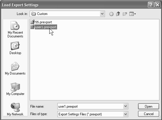 2. В открывшемся диалоговом окне Load Export Settings (Загрузить установки экспорта) выберите файл с сохраненными установками экспорта (с расширением prexport) и нажмите кнопку Open (Открыть) (рис. 4.18).