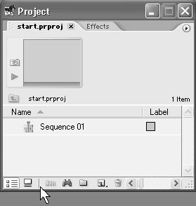 ? New Item (Создать элемент) – создает новые фильмы и специальные клипы как в окне Project (Проект), так и в отдельном окне, например – титры или цветовой фон. Эта кнопка эквивалентна действию пункта меню File>New (Файл>Создать);