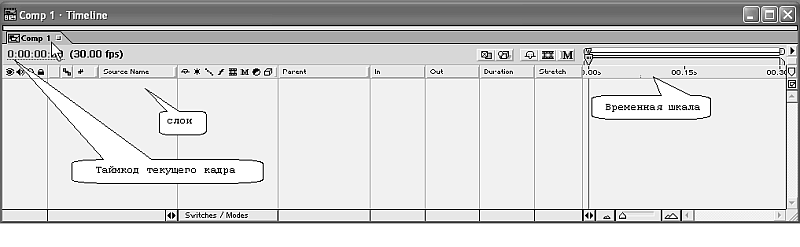 Конечно, не стоит забывать о том, что редактирование фильма в After Effects подразумевает работу над каждым его кадром. Поэтому особенности расположения слоев следует задавать в привязке к времени фильма (или, что то же самое, к номеру кадра). Для этих целей в правой части окна Timeline (Монтаж) находится временная шкала или линейка времени (time ruler), определяющая место каждого кадра для каждого слоя композиции (рис. 2.8).