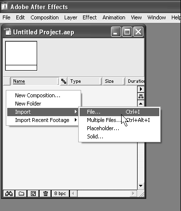 В любом случае перед тем, как получить возможность делать что-либо с предварительно подготовленными медиа-файлами, необходимо поместить их в окно Project (Проект) программы After Effects, или, говоря иначе, импортировать их в проект.