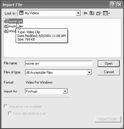 3. В открывшемся диалоге Import File (Импорт файла) перейдите к содержимому той папки, в которой находятся нужные вам медиа-файлы (рис. 3.5).