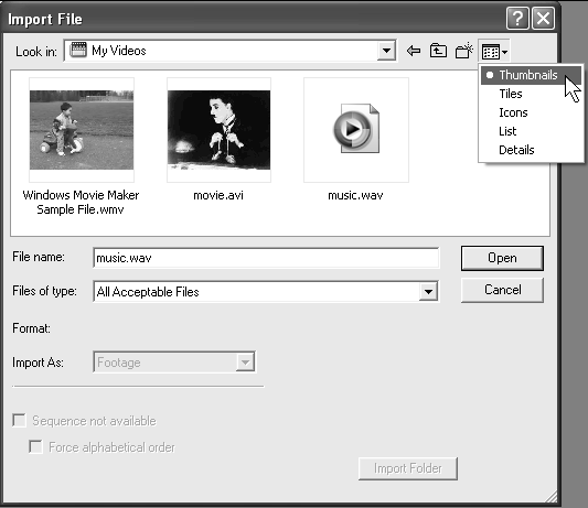 В диалоговом окне Import File (Импорт файла) можно управлять видом списка медиа-файлов при помощи соответствующего выпадающего меню (рис. 3.6). В частности, очень удобен вид просмотра Thumbnails (Миниатюры), позволяющий непосредственно в диалоговом окне Import File (Импорт файла) просматривать первые кадры файлов.