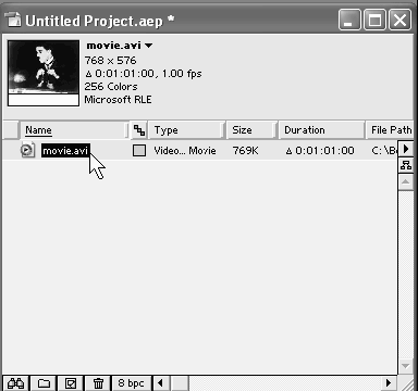 Как мы уже говорили, при загрузке программы After Effects создается новый проект, являющийся, по сути, записью всех ваших действий по редактированию фильма. Вначале проект пуст, и ваша задача – поместить туда необходимые файлы или в терминах видеомонтажа – клипы. Поэтому для того, чтобы начать монтировать полноценный фильм с помощью, вам необходимо иметь исходные видео-, звуковые или графические файлы на своем компьютере, проводя различные манипуляции с которыми, в итоге вы получите фильм. Эти файлы, или, по-другому, исходный материал (footage), может появиться в результате предварительной записи видео на цифровые носители (видеокамеры и т. п.), оцифровки аналогового видео при помощи устройств видеозахвата (capture devices), первичного монтажа (например, в программе Adobe Premiere или Windows Movie Maker) и т. д. Звуковые файлы могут быть изначально записаны с помощью микрофона, подключенного к звуковой карте вашего компьютера, а статические изображения – подготовлены в одном из графических редакторов (к примеру, в Adobe Photoshop или Microsoft Paint).