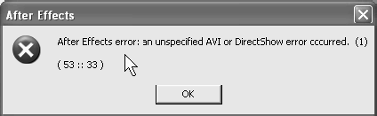 Рис. 3.8. Файлы, сжатые при помощи кодеков, не установленных в ОС, не распознаются After Effects