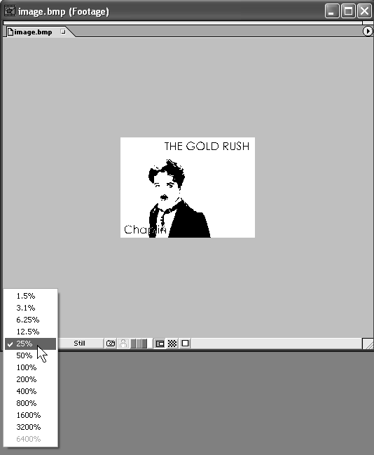 Рис. 3.23. Выбор масштаба просмотра клипа с рисунком в окне Footage