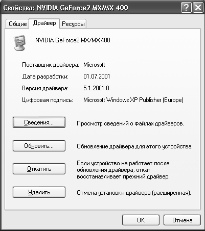 Запустите консоль Диспетчер устройств, щелкните на пиктограмме устройства в списке оборудования, в меню Действие выберите пункт Свойства. В открывшемся окне перейдите на вкладку Драйвер и воспользуйтесь одной из следующих кнопок (рис. 2.19):