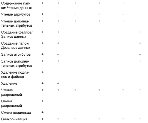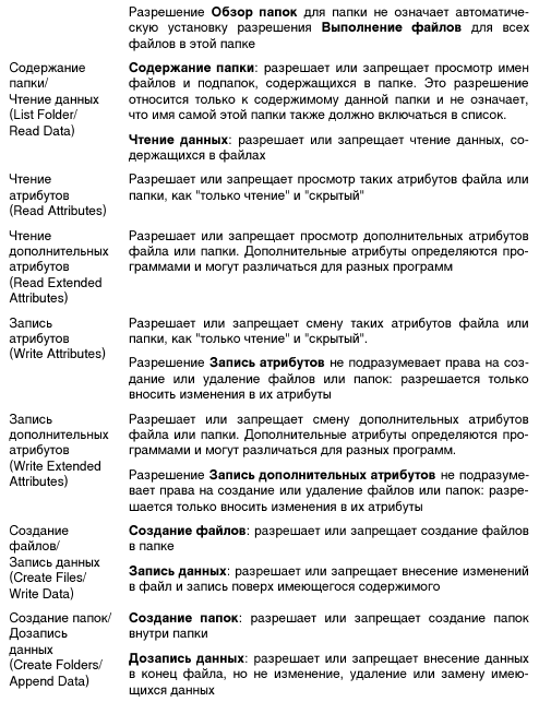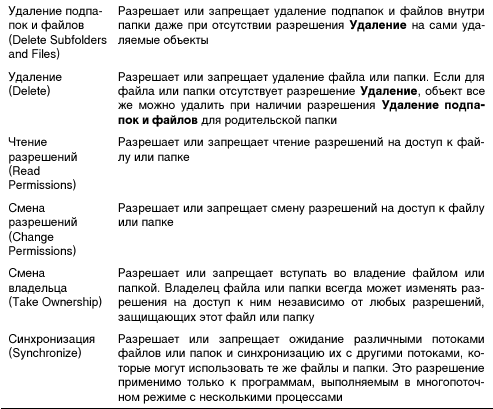 Стандартные встроенные наборы разрешений предназначены для быстрого и удобного предоставления необходимого уровня доступа пользователям и группам. Эти наборы представляют наиболее часто используемые сочетания разрешений. Если требуется более гибкая настройка прав доступа к файлам и папкам, можно предоставить каждому пользователю именно те разрешения, какие ему требуются, изменив стандартный набор. В табл. 3.3 описаны разрешения на доступ к файлам и папкам, составляющие стандартные наборы специальных разрешений.