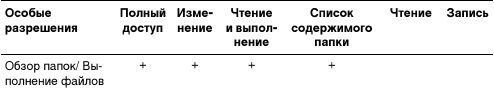 Из таблицы видно, что разрешения Список содержимого папки и Чтение и выполнение включают в себя одни и те же особые разрешения. Но наследуются они по-разному. Разрешение Список содержимого папки наследуется только папками, но не файлами, и отображается только при просмотре разрешений на доступ к папкам. Разрешение Чтение и выполнение наследуется как файлами, так и папками, и всегда отображается при просмотре разрешений на доступ к файлам или папкам.