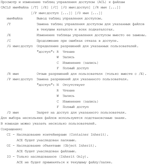 Утилита командной строки CACLS (Control ACLs, управление таблицами доступа) позволяет просматривать и редактировать разрешения в Windows ХР Professional и Windows ХР Home Edition. И еще одна утилита, XCACLS (Extended CACLS, расширенное управление таблицами доступа) находится в архиве SupportToolssupport.cab на установочном диске Windows ХР Professional.