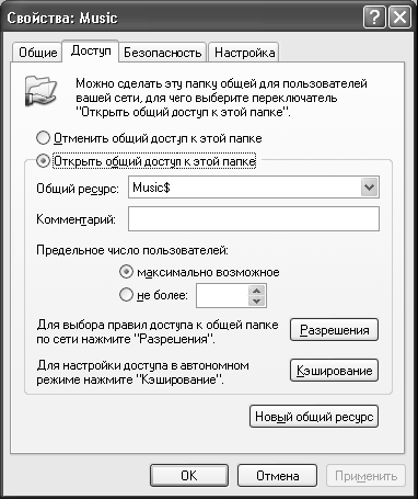 По умолчанию в качестве имени общего ресурса предлагается имя папки, предоставляемой в общее пользование. Если в конце имени поставить знак доллара "$", будет создан скрытый общий ресурс. Его имя не будет отображаться в Проводнике Windows ХР Professional или Сетевом окружении. Для доступа к такой папке потребуется ввести имя (вместе со знаком доллара) в окне Запуск программы.