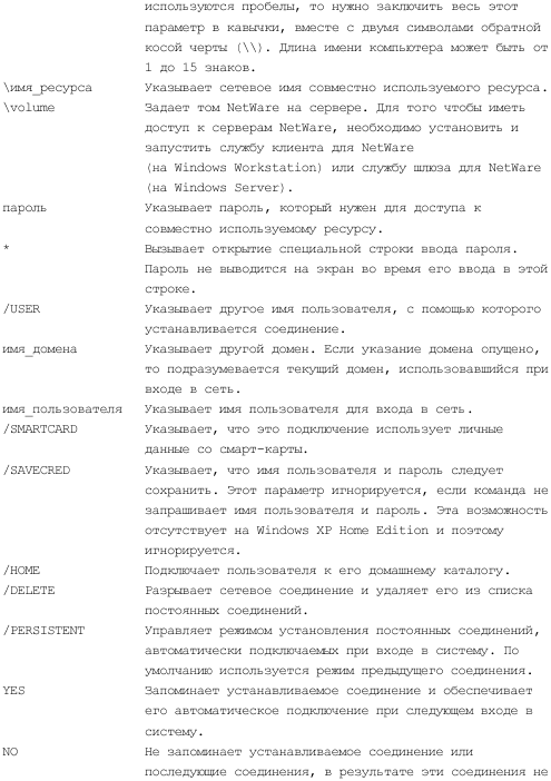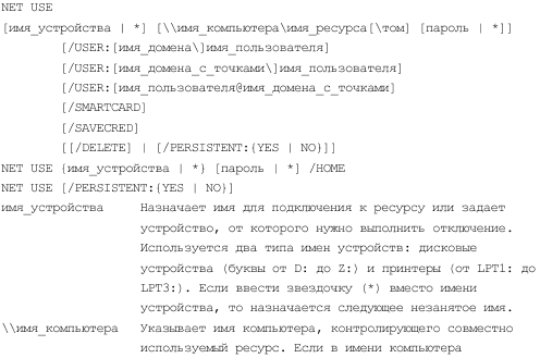 Команда net use позволяет управлять подключениями к общим сетевым ресурсам или вывод информации о подключениях компьютера, а также управляет постоянными сетевыми соединениями. Использование команды без параметров выводит список соединений для данного компьютера. Полный синтаксис команды net use в листинге 3.5.