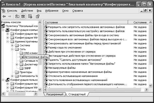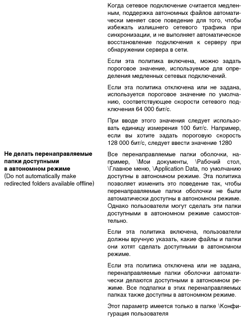 В настройках Групповой политики имеются параметры, влияющие на работу с автономными файлами. Несмотря на то, что знание Групповой политики в большей степени относится к сфере деятельности сетевых администраторов, при сдаче экзамена по Windows ХР Professional требуется хотя бы минимальное знакомство с этим инструментом. В этом разделе рассмотрим только те параметры, которые влияют на использование автономных файлов. Общие сведения об использовании Групповой политики см. в гл. 7.