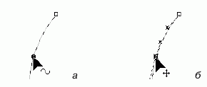 10. Выделите последний узел контура и переместите его к первому. Когда они окажутся достаточно близки друг к другу, рядом с черной стрелкой курсора появится маленькая изогнутая (рис. 3.47, б). Это говорит о том, что при данном расположении узлов программа замкнет контур.
