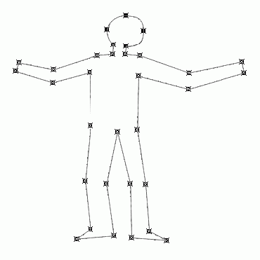 С помощью инструмента Bezier (Кривая Безье) нарисуйте фигурку человечка (рис. 3.48). Не стоит особенно следить за точностью линий и соответствием нашему варианту. Постарайтесь только, чтобы количество узлов вашего рисунка совпадало с нашим примером. Это облегчит дальнейшее выполнение упражнения. При построении используйте преимущественно прямолинейные сегменты, поскольку это значительно легче. С помощью кривых изобразите только голову человечка.