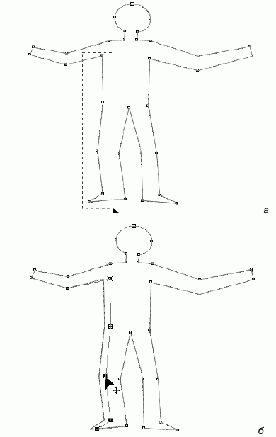 7. Не отпуская кнопку мыши, двигайте курсор вправо. За ним будут перемещаться и все выделенные узлы (рис. 3.50, б). При сдвиге узлы сохранят свое взаимное расположение, а крайние сегменты удлинятся. Перемещайте узлы до тех пор, пока тело человечка не станет симметричным.