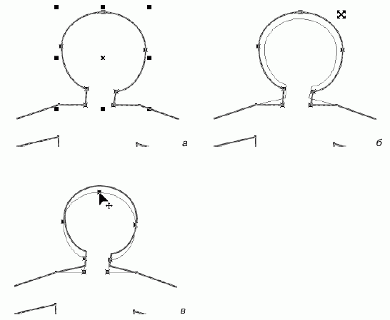 5. На нашем рисунке фигура человечка имеет неравную толщину справа и слева. Откорректируем положение узлов для устранения этого недостатка. Чтобы не переносить узлы поодиночке, их следует выделить. Процедура выделения нескольких узлов похожа на выделение множества объектов с помощью инструмента Pick (Указатель). Это можно сделать, последовательно щелкая на них курсором инструмента Shape (Фигура) при нажатой клавише <Shift>. Если узлов достаточно много и они расположены близко, удобнее воспользоваться выделительной рамкой. Именно так мы и поступили с пятью узлами в левой половине контура (рис. 3.50, а).