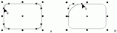 2. Нажмите левую кнопку мыши и перемещайте курсор от узла вдоль любого из смежных сегментов. Величина смещения курсора задает степень скругления углов (рис. 3.59, а).