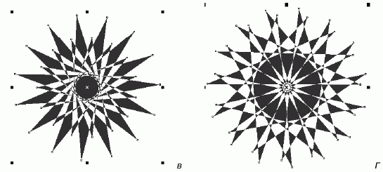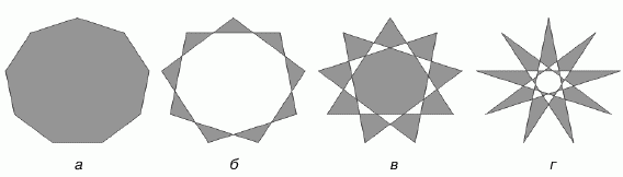 Рис. 3.65. Преобразование девятиугольника: а – исходный девятиугольник; б – г – звезды с различной глубиной лучей