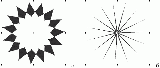1. Нажмите кнопку Star (Звезда) на панели свойств. Девятиугольник превратится в звезду с девятью лучами (рис. 3.65, б).