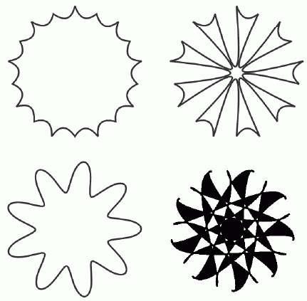 Возможно, вам доводилось видеть затейливые кривые, которые легко вычерчивает спирограф. Инструмент Polygon (Многоугольник) предоставляет вам еще более удобную возможность рисования подобных кривых и орнаментов. Любой многоугольник превращается в настоящее произведение искусства несколькими движениями инструмента Shape (Фигура) или Polygon (Многоугольник). Возникающий калейдоскоп сложнейших кривых может долго удерживать вас за этим занятием.