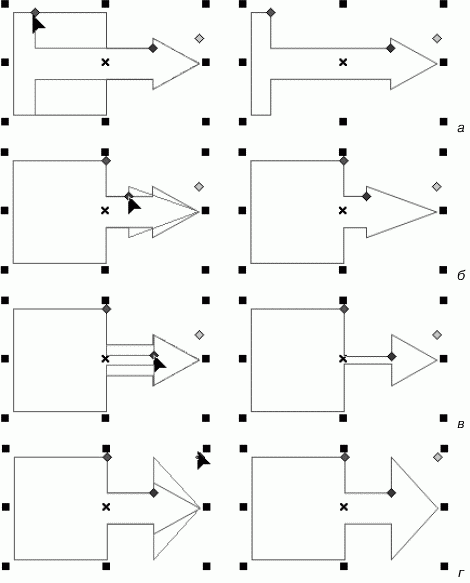 7. Воспользуемся глифами для ее редактирования (их у данной фигуры три). Они отображаются как красный, синий и желтый ромбики. Попробуйте перемещать красный глиф по горизонтали, желтый по вертикали, а синий – в обоих направлениях (рис. 3.74).