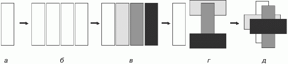 Рис. 3.75. Создание тестового образца: а – рисование прямоугольника; б – создание его копий; в – раскрашивание; г – поворот; д – размещение