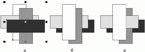 2. Выберите команду меню Back One | Arrange | Order (На уровень назад | Упорядочить | Порядок) или нажмите комбинацию клавиш <Ctrl>+<PgDn>. Черный прямоугольник оказался позади темно-серого, сместившись на один уровень «вниз» (рис. 3.76, б).