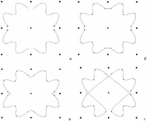 Эти команды заменили единственную Auto-close Curve (Автоматически замыкающиеся кривые), существовавшую в предыдущей версии. По существу она реализовывала третий вариант соединения, и вы можете найти ее кнопку на панели свойств инструмента Shape (Фигура) (см. разд. «Простейшие обводки и заливки» данной главы). Новый набор команд замыкания исключительно удобен, особенно для обработки трассированных изображений, полученных из программы CorelTRACE.