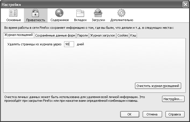 В любом случае я рекомендую установить количество дней хранения ссылок в журнале больше установленных по умолчанию девяти, иначе вы не сможете порыться в ссылках двухнедельной давности. Изредка это бывает очень полезным занятием. Кнопку Очистить журнал посещений нажимать нужно только в том случае, если заметите неладное, например, склонность админа к сбору компромата или перед уходом в отпуск.