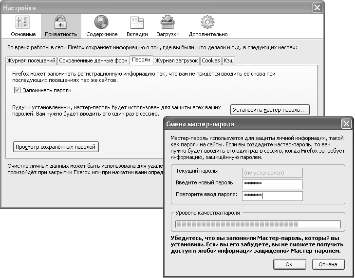 Здесь же, при помощи кнопки Установить мастер-пароль, можно задать пароль доступа к паролям. На рис. 1.7 представлено диалоговое окно для установки мастер-пароля. Оно примечательно тем, что в нижней части окна выводится индикатор качества пароля. Хороший пароль должен содержать буквы и цифры в количестве не менее шести знаков. Это усложнит задачу тому, кто захочет подобрать его методом перебора вариантов.
