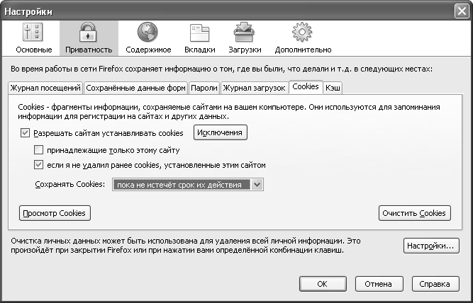 Такое же правило относится и к пункту Сохраненные данные форм. В принципе, хранить данные форм на защищенном локальном компьютере вполне приемлемо, тем более что пароли Firefox хранит в зашифрованном виде. Поэтому браузеру Firefox можно доверить сохранение данных форм, если, конечно, обеспечена безопасность самого компьютера. Не стоит ставить этот флажок лишь при работе с Firefox на общедоступных компьютерах.