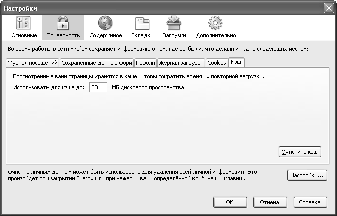 Если вы активный пользователь Интернета, пользуетесь им каждый день, то на вкладке Кэш (рис. 1.10) я рекомендую увеличить объем используемого дискового пространства до 100–150 Мбайт, если, конечно, позволяет объем свободного дискового пространства. Кэш хранит просмотренные недавно страницы на тот случай, если вы соберетесь к ним вернуться. По такому же, но более масштабному принципу действует кэширующий прокси-сервер, но если прокси уменьшает объем трафика на предприятиях или в частных сетях, то увеличение объема кэш-памяти сэкономит ваш личный трафик.
