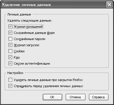 Если вы внимательно рассматривали снимки окна настройки, то могли заметить область очистки данных под каждой вкладкой в разделе Приватность. Она содержит одну-единственную кнопку – Настройки. Эта кнопка вызывает диалоговое окно Удаление личных данных (рис. 1.11). В нем можно настроить Firefox на удаление всех или выбранных личных данных при выходе из программы. Для разового удаления просто отметьте нужные пункты и нажмите кнопку ОК, а для стирания следов при выходе из программы поставьте флажок Удалять личные данные при закрытии Firefox.