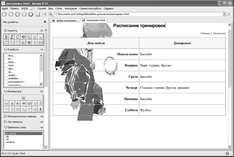 Документация является очень сильной стороной редактора Amaya (рис. 2.6). В ней вы найдете подробное описание функций программы и наглядные примеры. Особенно рекомендую ознакомиться с разделами Математика и Графика. Вы, по крайней мере, получите наглядное представление о том, как используются относительно новые технологии MathML и SVG.
