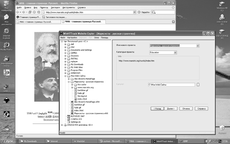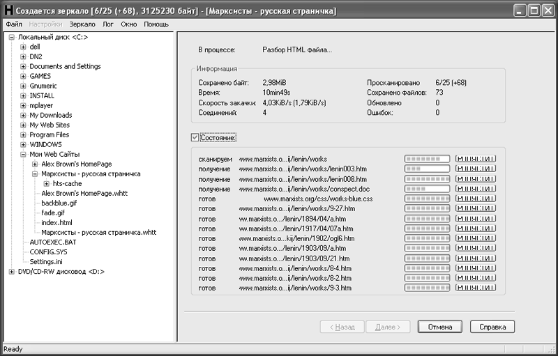Рис. 4.7. Процесс, как говорится, пошел! Программа WinHTTrack создает локальную копию русской части сайта марксистов