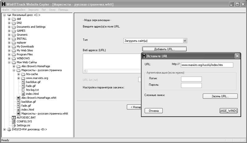 Чтобы добавить адрес, переключитесь в окно браузера и скопируйте адрес странички в буфер обмена. Затем снова перейдите в окно программы WinHTTrack, нажмите кнопку Добавить URL и вставьте в поле URL скопированный из браузера адрес.