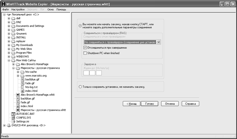 Рис. 4.6. После окончания загрузки WinHTTrack может отключиться от Интернета или вовсе выключить компьютер