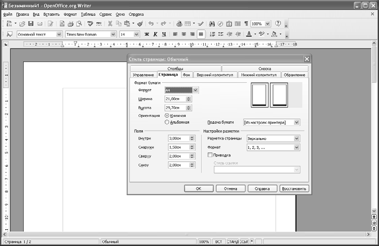 Затем обратите внимание на область Поля. В русской версии OpenOffice.org Writer поля бумаги по умолчанию равны 2 см со всех сторон. В нашем случае придется привести эти параметры в соответствие требованиям вашего руководителя. Чаще всего с учетом переплета левое поле придется увеличить до 3–3,5 см, а остальные – уменьшить до 1,5. Кроме того, если у вас есть возможность двусторонней печати, то вы можете установить внутренний и внешний отступы от края бумаги. Для этого в выпадающем списке Разметка страницы выберите пункт Зеркально и установите соответствующие значения полей (например, 3 см внутри и 1,5 снаружи). Пользуясь случаем, я призываю как можно чаще использовать возможность двусторонней печати: экологи, не говоря уже о лесных жителях, будут вам весьма признательны за экономное расходование продуктов лесоперерабатывающей промышленности.