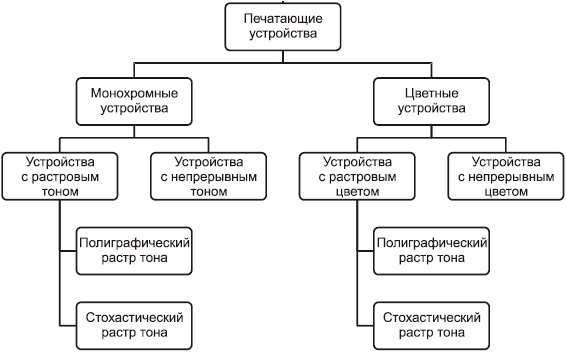 Печатающим устройством или принтером называется периферийное устройство компьютера, преобразующее информационную модель в визуально воспринимаемое изображение на плоском носителе (бумаге, ткани или полимерной пленке). Принципы, на основе которых на носителе формируется изображение, можно разделить на несколько категорий (рис. 1.1.2).