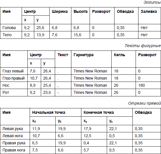 К сожалению, этот известный всем текст содержит явно недостаточно информации для однозначного воспроизведения изображения, и автору пришлось многое добавлять от себя. В частности, не было никаких указаний о расположении упомянутых графических объектов и об их размерах. Результаты доработки представлены в табл. 1.2.1.