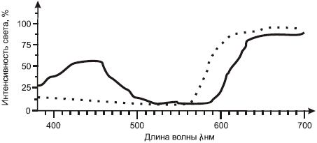Приведенные на рис. 1.3.2 спектральные диаграммы были получены с помощью спектрофотометра – специального прибора, позволяющего построить спектр по образцу цвета. В качестве образцов были взяты спелая слива (сплошная линия) и строительный кирпич (точечная линия). Как можно видеть из спектральной диаграммы, цвет сливы образуется совместным воздействием волн фиолетово-синего и красного диапазонов видимого спектра, а цвет кирпича – волнами желтого и красного диапазонов.