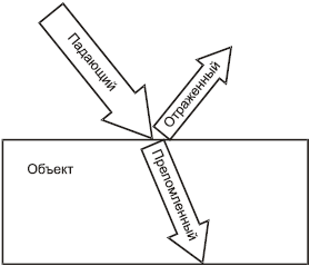 При падении светового потока на поверхность объекта параллельно протекают два процесса: отражение и преломление, которые на рис. 1.3.3 условно представлены в виде стрелок.